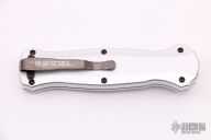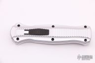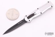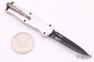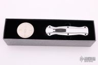 "Introducing an OTF like none-other.. The new Infidel® is rapidly making believers out of many a skeptic. Built for strength and reliability the patent pending double-action mechanics get it done over the long haul. Grab on and you will find the handle grip rock-solid with its patented machined in Presidio® style bi-directional tread pattern, and overall generous sizing for gloved hands. Intuitively pressure the release-slide forward and its spear-point edged steel fires and locks up with a unique three-point retention system with amazingly negligible blade play. Reverse the process and the blade retracts in a rapid blur of motion. The Benchmade Infidel is a special operator’s fantasy come true." Black coated blade. This one has a silver handle and comes with original box, papers and 10th Anniversary coin. Excellent condition. Limited Edition #3839.