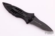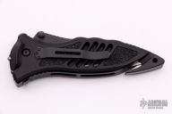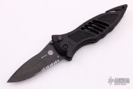This CQD Mark 1 Folder from Masters of Defense has a black partially serrated blade with dual thumbstuds. Handle is black aluminum with non-slip inserts, reversible stainless steel tip down clip, seat belt cutter, lanyard hole and glass breaker. Comes with black nylon sheath. Light scuffs are visible on the blade otherwise the knife is in Excellent condition.