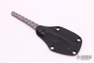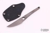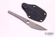 This knife by Jens Anso features a chisel ground bead blasted blade with .193" blade stock and .653" blade depth, full tang construction with sculpted handle. Comes with a kydex sheath. Has some sheath scuffs, otherwise excellent condition.
