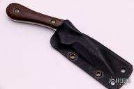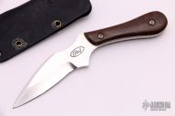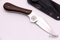 This neck knife by Dale Reif is a Laci Szabo design, it features a hand rub satin finished blade with .161" blade stock and .821" blade depth, full tang construction. The handle has brown canvas micarta scales. Comes with a kydex sheath. Has a few light scratches, otherwise excellent condition.