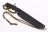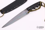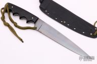 This Military Stiletto by Fred Perrin features a blued clip point blade with notched thumbrest. 0.201" blade stock and 1.438" blade depth. The handle is comprised of black micarta scales with nickel silver pins over full tapered tang construction. Includes kydex sheath. Has a few light scratches and a spot of rust on the choil, otherwise good condition.