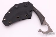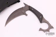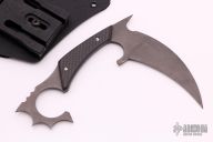 This Karambit (please let us know if you know who this maker is) features a chisel ground bead blasted double edged blade with .136" blade stock and 1.255" blade depth, full tang construction with carbon fiber scales. Comes with a kydex sheath with TekLok. Has some scuffs, otherwise excellent condition.