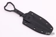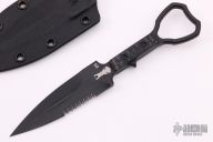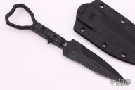 This knife features a dark grey coated spear point blade with a partially serrated edge, false tope edge, .240" blade stock and 1.060" blade depth, full tang construction with black G-10 scales. Comes with kydex sheath. Excellent condition.