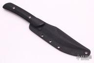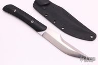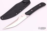 This Slim Fighter by Dirk Pinkerton features a satin finished blade with false top edge and notched thumbrest, .158" blade stock and 1.137" blade depth, full tang construction. The handle has black G-10 scales. Comes with a kydex sheath. Has a few light scratches, otherwise excellent condition. One of three made about 2010-2012.
