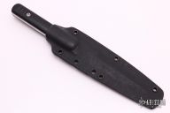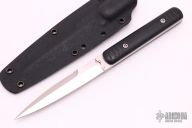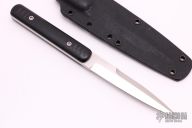 This Dirk by Dirk Pinkerton features a satin finished blade with false top edge, .154" blade stock and .685" blade depth, full tang construction. The handle has black G-10 scales. Comes with a kydex sheath. Has a few light scratches and two small rust spots, otherwise good condition.