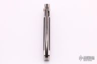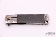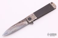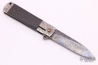 This knife by Vincenzo Balistreri features a Damascus blade with notched thumbrest and flipper. The handle has an engraved stainless steel frame with carbon fiber scales, notched Damascus backspacer, carbon fiber inlay in pivot, stainless steel lockface insert. Has a few light scratches, otherwise excellent condition. Comes with a zippered case.