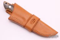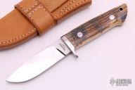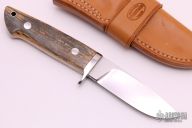 This drop point hunter by Schulyer Lovestrand features a drop point blade with satin finish flats, mirror polish grinds, and notched thumbrest, .178" blade stock, 1.093" blade depth. Full tapered tang construction with stainless guard, red fiber liners, and mammoth ivory handle. Beautiful fit and finish. Excellent work. Comes with a brown leather sheath. Excellent Condition.