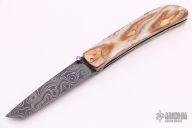 This linerlock by Theuns Prinsloo features a Damascus blade with a single anodized titanium thumbstud. The handle has mammoth tooth scales with black liners, anodized titanium liners and a head colored and fileworked stainless steel backspacer. Nice detent, lockup and blade seating. Rides on bearings. Excellent condition. Comes with a zippered case.