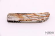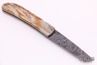 Before he became a full-time knifemaker, he was a headmaster of a school for students with learning disabilities. He seriously committed to making his first knife after his 16 year old son passed away in 1994. He became a full-time maker in 1996 and is a Knife Guild of South Africa member. Theuns never makes the same knife twice. Some knives may use the same materials or have a shape that is somewhat similar, but what separates a Theuns Prinsloo knife is in the details. I heard that when Michelangelo was painting the Sistine Chapel there were places he painted that would never be seen by human eyes, but Michelangelo painted them anyway because God would see them. The next time you pick up one of Theuns Prinsloo’s folding knives, open it. Look inside the recess where the blade seats and prepare to be amazed. Theuns painstakingly makes an etching on the inside each of the backspacers that usually depicts an African bushman scene with the backdrop being the mountain that is visible from his backyard.