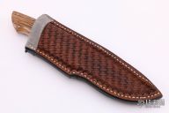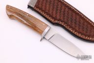 This drop point hunter by Schulyer Lovestrand features a satin finished drop point blade and notched thumbrest, .167" blade stock, 1.055" blade depth. Full tapered tang construction with stainless guard, red fiber liners, and mammoth ivory handle. Beautiful fit and finish. Excellent work. Comes with a brown leather sheath , fits nicely but is not original. Excellent Condition.