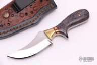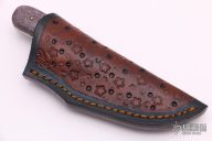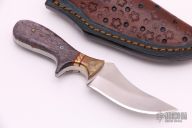 This knife features a satin finished blade with .190" blade stock and 1.051" blade depth, full tang construction. The handle has brass bolsters, giraffe bone scales and red/brass spacers. Comes with a hand tooled brown leather sheath. Excellent condition.