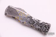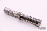 This Hera by Anthony Marfione features a double-edged mirror polished blade with satin flats and dual fullers. The handle has an engraved stainless steel frame with 18kt and 24kt gold inlays, a tip down titanium clip with ceramic ball inset. Dated 05/2020. Comes with original hand signed box and zippered case. Excellent condition. Engraving done by Jody Muller.