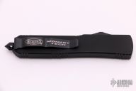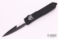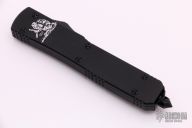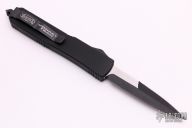 This "Monkey Tech 007" by Microtech has a black bayonet ground double-edged blade. The handle has a black aluminum frame with black stainless hardware and tip down clip. Comes with original box and papers. Excellent condition.