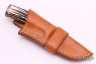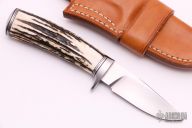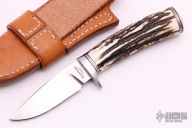 This hunter features a hand-rubbed satin finish blade, .162" blade stock and .952" blade depth, hidden tang construction. The handle has a SS guard and butt, stag handle with black and stainless steel spacers. Comes with a brown leather sheath and nylon zippered case. Excellent condition. Beautiful knife.