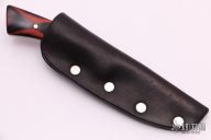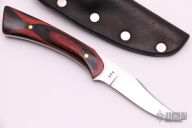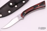 This Knife by Barry Dawson features a satin finished blade with .132" blade stock and .668" blade depth, full tang construction. The handle has pakka wood scales. Comes with a black leather sheath with belt loop and a zippered case. Has some scratches, otherwise excellent condition. stamped 115