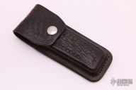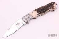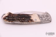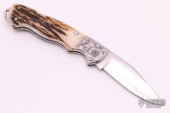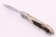 This lockback folder by Glenn Marshall features a polished blade with fileworked spine and nail nick. The handle has dovetailed and engraved stainless steel boslters, stag scales, stainless steel liners and fileworked backspacer. Comes with a black leather belt sheath. Has some scratches, otherwise good condition.