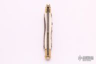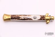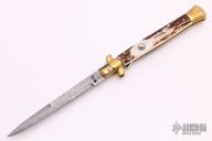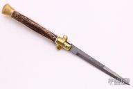 This Swivel Bolster from AB Italy features a Damascus bayonet ground blade. The handle is comprised of brass bolsters and pommel with stag scales over brass liners and steel backspacer. Excellent condition.
