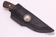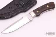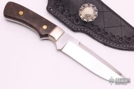 This knife by Steve Frist features a hand rub satin finished blade with false top edge, .199" blade stock and 1.416" blade depth, full tang construction. The handle has nickel silver bolsters, walnut scales with brass pins and red/white spacers. Comes with a hand tooled brown leather sheath with belt loop. New from maker.