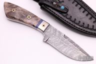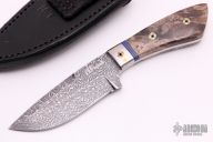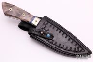 This knife by Steve Frist features a Damascus blade with false top edge, .154" blade stock and 1.417" blade depth, full tang construction. The handle has stainless steel bolsters, wood scales with mosaic pins and blue/grey spacers. Comes with a hand tooled black leather sheath with belt loop and a turquoise inlay on the keeper. New from maker.