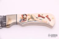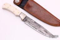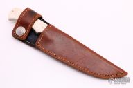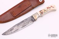 This knife by Steve Frist features a Mosaic Damascus blade with fileworked spine, .136" blade stock and 1.172" blade depth, full tang construction. The handle has nickel silver bolsters, mammoth ivory scales with black and white spacers. Has scrimshaw. Comes with a brown leather sheath with belt loop. New from maker.