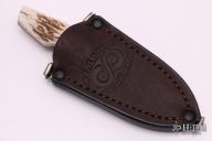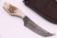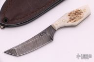This Neck Knife from Olamic Cutlery features a Damascus blade with .122" blade depth and .802" blade stock, full tang construction. The handle is comprised of stag scales. Includes leather neck sheath. Excellent condition.