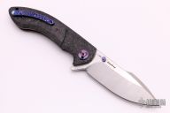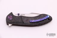 This Eric Ochs designed knife by Massdrop features a satin finished blade with a false top edge and flipper. The handle has marble carbon fiber scales with stippled faux bolsters, anodized titanium hardware, mokuti pivot collars and tip up clip with hidden screws, anodized titanium liners, notched carbon fiber backspacer, lanyard hole. Comes with original box and zippered case. Excellent condition.