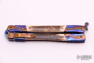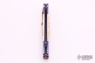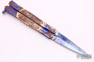 This Balisong by Suchat Custom Knives features a hot salt blued mosaic Damascus dagger blade with false top edge. The handle has carved and anodized titanium bolsters ,fileworked and anodized titanium liners, mammoth ivory scales, mosaic Damascus latch with ruby insets, tip down anodized titanium clip. Flips nice and smooth. Excellent condition. Comes with a zippered case.