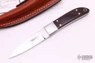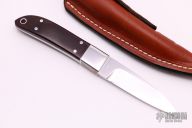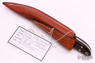 This Loveless Style Randall Hunter by Carl Colson features a mirror polished blade with notched finger rest, .179" blade stock and .824" blade depth, full tapered tang construction. The handle has a 416 stainless steel bolsters and pins, lanyard hole at the butt, maroon linen micarta with white liners. Comes with a Wickett & Craig brown leather sheath made by Carl Colson. Comes with COA dated 06/25/2020 and #981 on the blade and sheath.