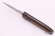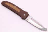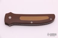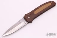 This custom automatic by Mel Pardue features a Damascus spear point blade with false top edge. The handle has brown paper micarta scales with tan rubber inserts, push button with red linen micarta inlay. Strong and fast coil-spring opening. Great feel in the hand. Excellent condition. Come with a zippered case.