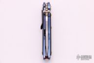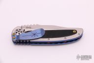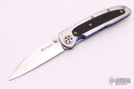This knife by Allen Elishewitz features a stonewashed wharncliffe blade with dual thumbstuds and a notched thumbrest. The frame is two-tone titanium with black G-10 overlays. The tip down pocket clip is anodized titanium. Nice detent, lockup and blade seating. Includes nylon sheath with belt loop. Has some light scratches otherwise excellent condition.