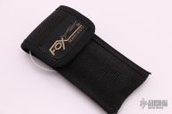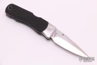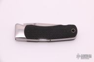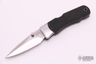 This Lockback has a satin finished stainless steel spear point blade with single thumbstud. Handle is non-slip over satin finished stainless steel frame, and stainless steel liners and back spacer. Lanyard hole. Has some light scratches, otherwise good condition. Nice lockup and blade seating. Comes with black nylon sheath.