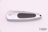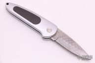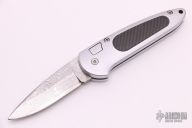 This Damascus Top Lock coil spring button lock auto by Boker features a Damascus blade and aluminum frame with carbon fiber inlays. Comes with original box. Dated 1996 and serialized number 811. Excellent condition.