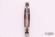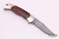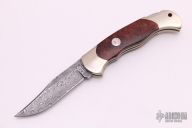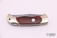 This lockback folder by Boker features a Damascus blade. The handle has nickel silver frame, burl wood inlays, and a stainless steel backspacer. Comes with original box, sheath and papers. Has a few light scratches, otherwise excellent condition.