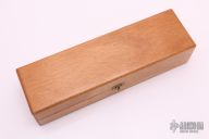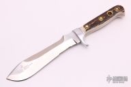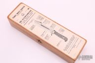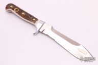 The White Hunter is the ultimate outdoorsman’s knife, originally designed by African professional hunters. It features a curved blade for cutting, slicing and skinning and a strong back edge for hacking. Handmade by skilled craftsmen with stag scales, it has a 6-inch blade, 10.75 inch overall length, custom proofed Rockwell hardness, and comes with a wooden presentation box. Has a few light scratches, otherwise excellent condition.