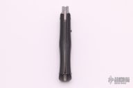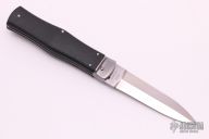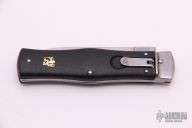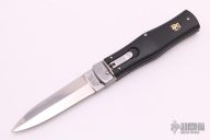 This Leverlock Auto by Mikov Knives features a polished spear point blade with false top edge. The handle is comprised of steel bolsters, lever and pins with black plastic scales over steel liners and backspacer. Strong leaf spring action. Has some scratches, otherwise excellent condition.