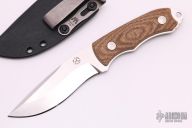 This knife features a stonewashed recurved blade with a notched thumb rest and a full tang construction. The handle features tan micarta scales. Includes a kydex sheath. Excellent Condition.