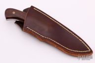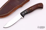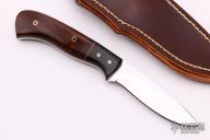 This Hunter by Mickey McGahee features a mirror polished blade with .130" blade stock and .887" blade depth, full tang construction. The handle has ebony bolsters, cocobolo scales with red liners and mosaic pins. Comes with a brown leather sheath and COA. New from maker.