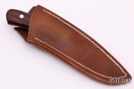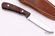 This Hunter by Mickey McGahee features a mirror polished blade with notched thumbrest, .133" blade stock and .897" blade depth, full tang construction with cocbolo scales. Comes with a brown leather sheath and COA. New from maker.