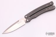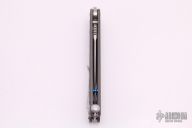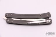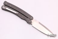 This Mayhem Balisong by Bradley Cutlery features a tumble finished spear point blade with swedge and notched thumbrest. The handle is comprised of blasted titanium over blue anodized aluminum barrel spacers. The stainless steel pocket clip is positioned for tip up carry. Steel T latch on pommel. H Includes original drawstring pouch papers and box.  Scuffs are visible on the handle otherwise the knife is in excellent condition.