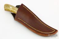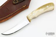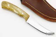 This Skinner by Mickey McGahee features a mirror polished blade with .129" blade stock and .955" blade depth, full tang construction. The handle has giraffe bone scales with red liners. Comes with a brown leather sheath and COA. New from maker.