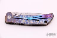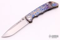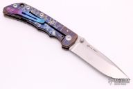 This framelock folder by Spartan Blades features a stonewashed drop point blade with dual thumbstuds and a notched thumbrest. The handle has a custom anodized titanium frame with a tip up titanium clip and filler tab. Anodizing done by Robert Durand. Has nice detent, lockup, and blade seating. Comes with original box. Excellent condition.