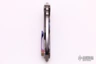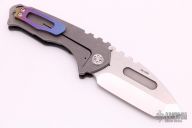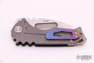 This Praetorian Genesis T from Medford Knife and Tool features a stonewashed drop point tanto style blade with fuller, notched thumbrest and dual thumbstuds. The handle is comprised of a custom anodized titanium frame over a D2 backspacer/glass breaker, anodized titanium tip up clip. Anodizing done by Robert Durand. Great blade seating, detent and lock up. Includes original packaging and papers. Excellent condition.