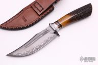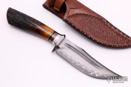 Another absolutely stunning piece from the Sobral brothers! This Rhino features a San Mai Damascus blade with false top edge and deep fullers, .228" blade stock and 1.484" blade depth, hidden tang construction. The guard is stainless steel with a beautiful stag grip, nickel silver and micarta spacers. This piece comes in an equally impressive, hand tooled, brown leather sheath and a leather zippered case. New from maker.
