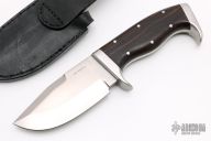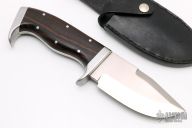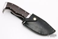 This fixed blade from Jeff Chaffee features a satin finish blade with false top edge, .245" blade stock and 1.920" blade depth, full tang construction. The handle is comprised of stainless steel guard and butt, wood scales. Includes a black leather sheath. Has some light scratches, otherwise excellent condition.