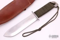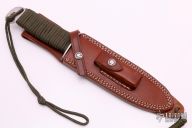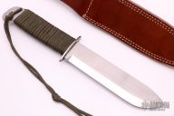 This knife by Mako has a satin finished blade, steel guard and cord wrapped handle, .236" blade stock and 1.684" blade depth. Has some light scratches, otherwise excellent condition. It comes with a Randall. Model C – Supplied with Models 14, 15, 17 and 18. Especially designed under the auspices of the U.S. Marine Corps for these knives. With hone in pocket. Fitted with tie-down thongs (5 1/2″ ‘C’ sheath has single stitch and 7 1/2″ ‘C’ sheath has double stitching). Excellent condition.