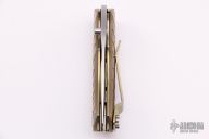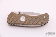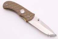This Left Handed EDC by Rainy Vallotton features a satin finished blade with false top edge and single thumbstud. The handle has tan G-10 scales, anodized titanium liners, and a 440C backspacer. Has been used and carries, has scuffs and scratches, otherwise good condition. "PM001" on blade.