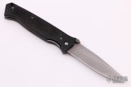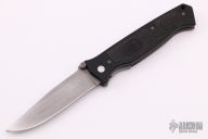 This Vallotton Chameleon D/A has a clip point, bead blasted blade with dual thumb studs and notched thumb rest. Handle is black FRN composite scales with rubber inlay, stainless steel liners and tip up clip. This knife has a hidden button under the rubber inlay on the A-side. Includes nylon velcro sheath. Has some scuffs and scratches, missing the clip, otherwise good condition.