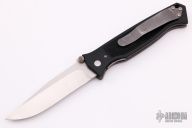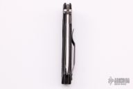 This Lefty Chameleon D/A linerlock by Butch Vallotton has a hidden push button under the rubber scale on the back side of the handle. Leaf spring action and smooth manual action. Satin finished blade and FRN handle scales with rubber inlays, stainless steel liners and tip up clip. Good function, good lockup and blade seating. Numbered #885on back side of blade. Has some scuffs on the clip, otherwise excellent condition.