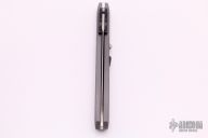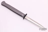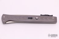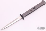 This Phantom Italian swing guard automatic by Dynamic Knife Designs has a satin finish blade and black aluminum handle. Features a ramped side positioned stainless steel safety just below the firing button. False top edge. Button release/single action with closure via the rear positioned lockbar release. Dual leaf and coil spring action providing an extremely fast opening. When closed, the dual guard rests on the frame, encompassing the blade tang. Upon opening, the guard swings into a locked position. Excellent condition. Comes with original box.