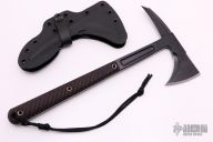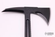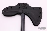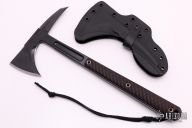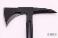 The 13" Kestrel Tomahawk is a highly capable tool and is a more compact version of the venerable 18" RMJ Eagle Talon. This multi-use tomahawk was designed to cut through difficult obstacles as well as for use as a breaching and extraction tool on buildings and/or vehicles. It is a tool intended to help you win the day, whatever challenges you may face. RMJ considers weight to be an asset of the Kestrel and at 1 pound 9 ounces it packs a punch. The 13” length means it can also be wielded effectively in tight spaces. The Kestrel offers full tang construction made from 3/8" 80CRV2 carbon steel and has a Black Cerakote finish for increased corrosion and wear resistance. This is a very heavy use tool and the full tang construction absorbs impact while the hardened striking surface of the head delivers powerful impact force without chipping or shattering. The permanently attached Johnny Red G10 handle scales offer a contoured 3D texture that works effectively in both wet and dry environments without an overly aggressive feel. The 3” forward facing edge is razor sharp and is complimented by a 3" distal tapered spike that can be used for digging, shattering tempered glass, penetrating sheet metal, hacking through concrete and wood or breaking chains and hardened padlocks. It is also a highly functional piece of kit for first responders who require a tool for breach and extraction work. The 13" length won't impede movement yet can make quick work of penetrating anything that it comes in contact with.